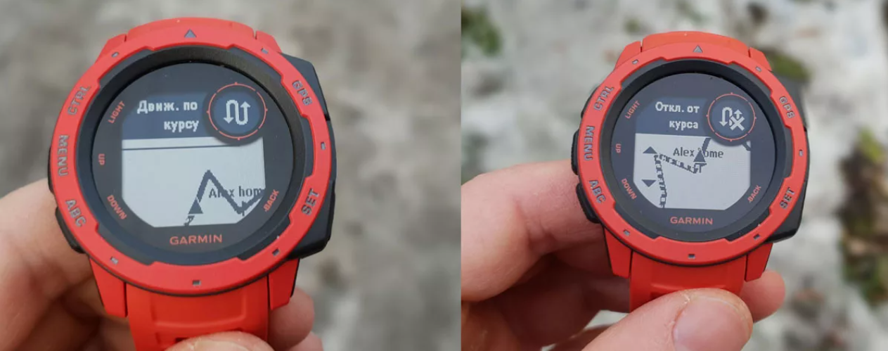 Сохранённые треки в часах Garmin Instinct называются дистанции, точки – сохранённые местоположения. Обе эти функции активируются в меню Навигация. При выборе дистанции можно выбрать также режим «Пройти в обратном направлении». Ориентироваться при активировании трека просто: вам нужно идти по стрелочке на часах. При отклонении от маршрута появляется предупреждающее сообщение.