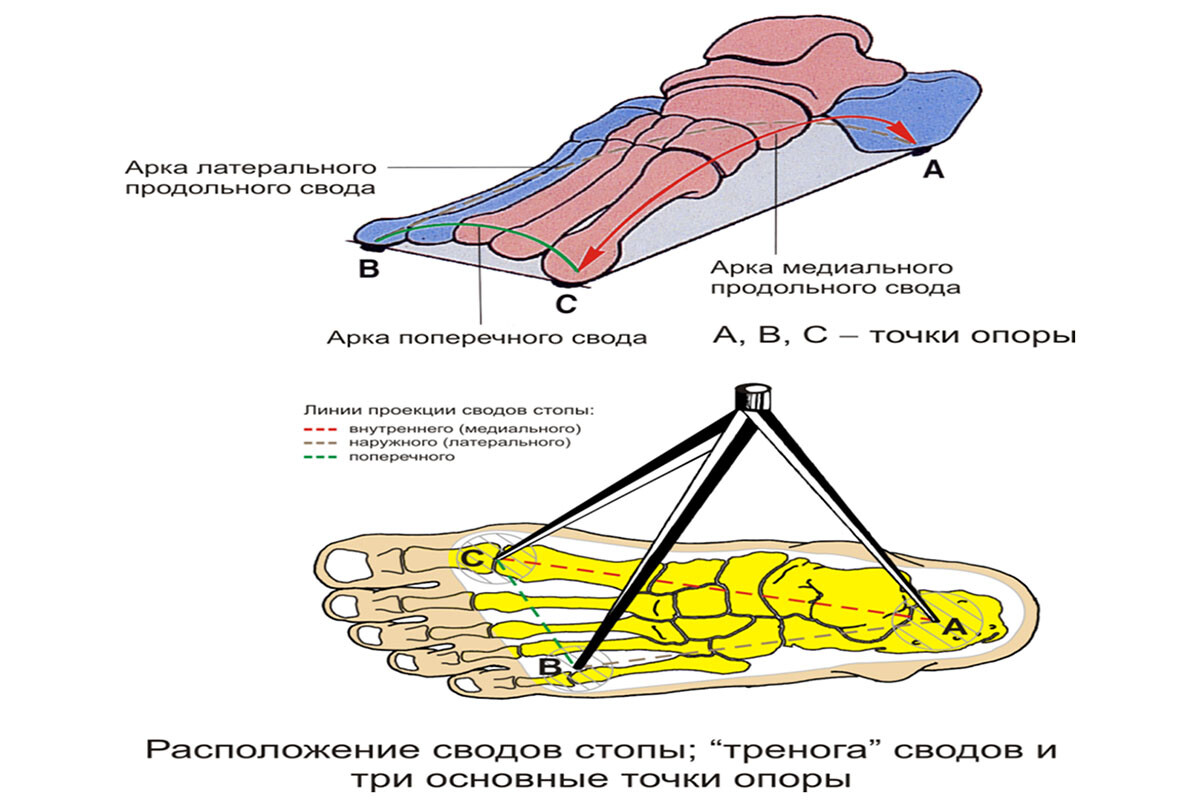 Эти три точки объединены системой арок, удерживающих подошвенный свод стопы, — передняя поперечная арка и две продольных боковых арки. Наивысшая точка свода называется подъемом стопы, она расположена между ладьевидной и таранной костями.