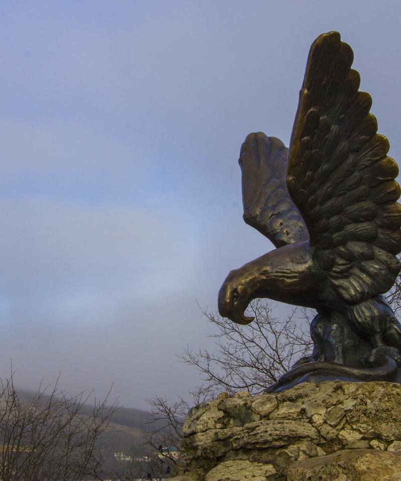 Большая статуя хищной птицы, покоряющей змею, считается символом курорта. Эта бетонная скульптура, воплощение силы и здоровья Кавказа, стала неотъемлемой частью городской легенды. Ее установили в 1901 году. Статуя создавалась как вершина лестницы в несколько ярусов, которая вела к парку на Горячей горе. И.И.