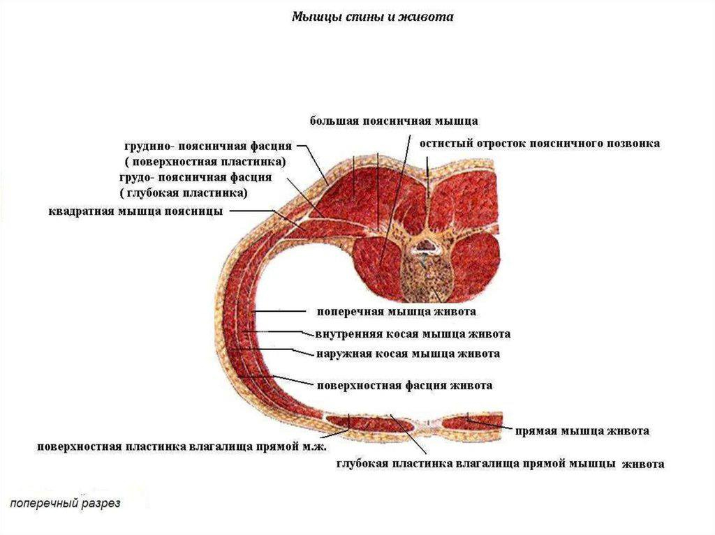 Здесь еще нужно сказать, что поперечная мышца живота тянется к поперечным отросткам позвоночника. Фасции внутренних и внешних косых, прямой мышцы живота идут туда же.