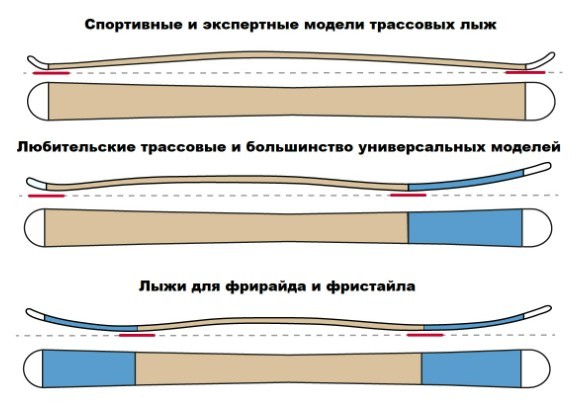 Загнутые кверху части лыж называют рокерами. Обратный прогиб называется “кембер”. Рокер отвечает за всплытие лыж в свежем снегу. В зависимости от назначения лыж кембер и рокер будут иметь разные пропорции.