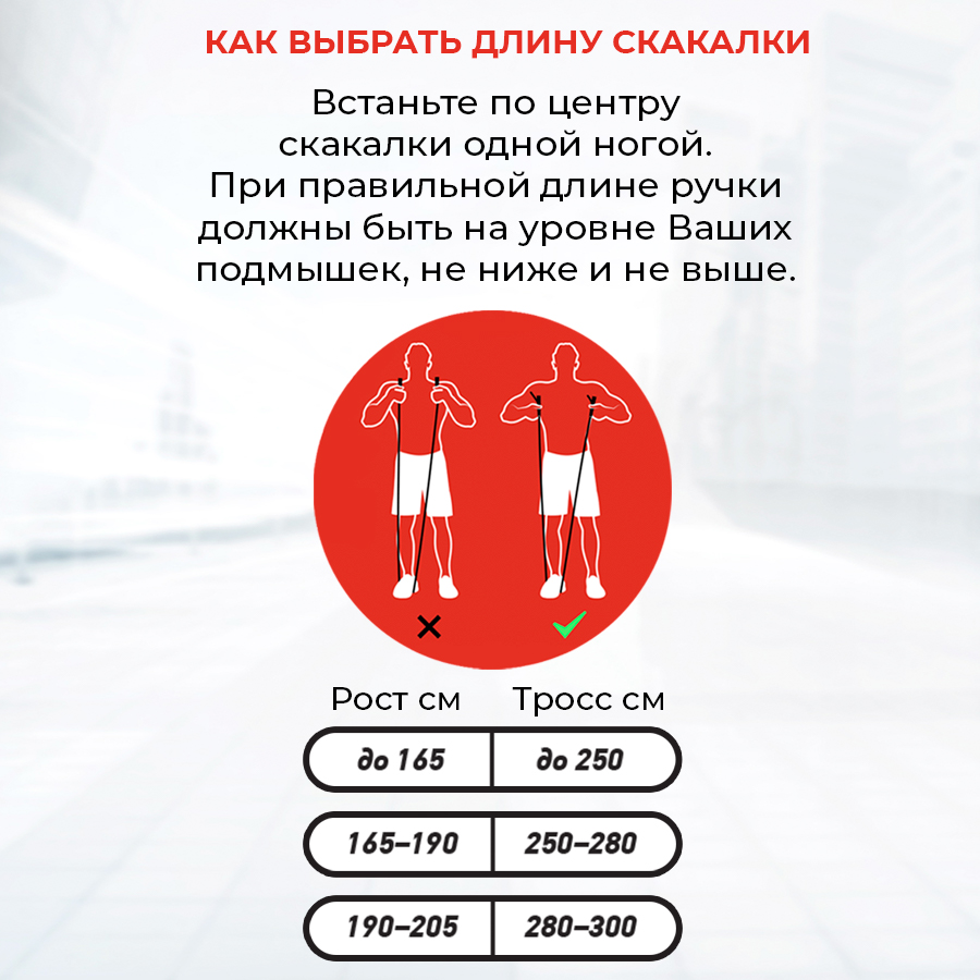 Длина скакалки подбирается в соответствии с ростом и уровнем подготовки спортсмена. Можно посмотреть соответствующие таблицы, где указана оптимальная длина для конкретного роста. Особое внимание стоит обратить на материал ручек — поверхность не должна скользить. Сегодня производители изготавливают скакалки с ручками из дерева, неопрена, пластика, металла.