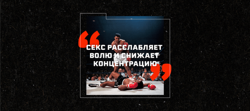 Воздерживался от секса аж за шесть недель до боя, считая, что он расслабляет волю и снижает концентрацию. «Воздерживаясь от секса, ты становишься великим воином», — говорил Али.