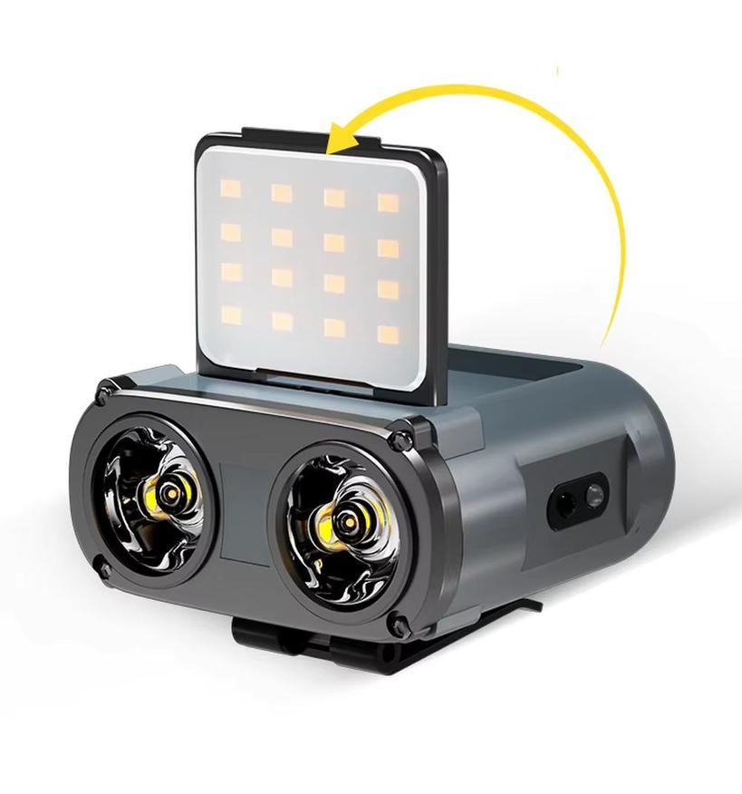 Необычная моделька налобного фонарика с двумя раздельными светодиодами с линзами в качестве одного источника света (500Лм), а также, вертикальной откидной световой панелью в качестве второго. Кроме этого, между основными светодиодами установлен еще один небольшой, который можно использовать в качестве аварийного мерцающего сигнала (светит красным светом).