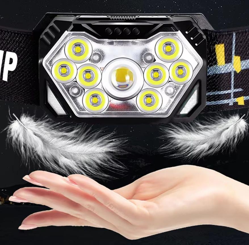 Хороший вариант недорогого, но мощного налобного фонарика, оснащенного девятью яркими светодиодами в едином корпусе. Суммарно светодиоды выдают световой поток до 2000Лм. Шесть режимов работы, включая аварийный стробоскоп красного цвета. Помимо обычной кнопки фонарик оснащен индукционным управлением жестами для его включения и выключения, что за его цены очень даже неплохо.