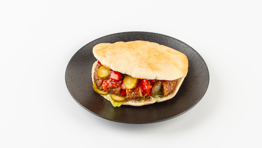 Веганская пита с растительным мясом, приготовленная с маринованными огурчиками, красным сладким перцем и маринованным луком. Томатная сальса с перцем халапеньо делает питу ещё сочнее и придаёт её вкусу лёгкую пикантность.