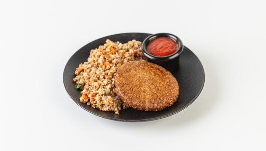 Полноценный веганский обед из сочной растительной котлеты и рассыпчатой гречки, сдобренный пряным томатным соусом. Идеальный вариант для обеда или ужина, который мы доставим горячим.