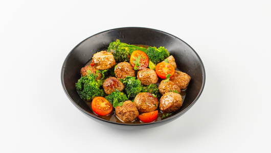 Сытный веганский обед: слегка пряные фрикадельки из текстурированного растительного белка в пикантном соусе сальса и хрустящая брокколи.