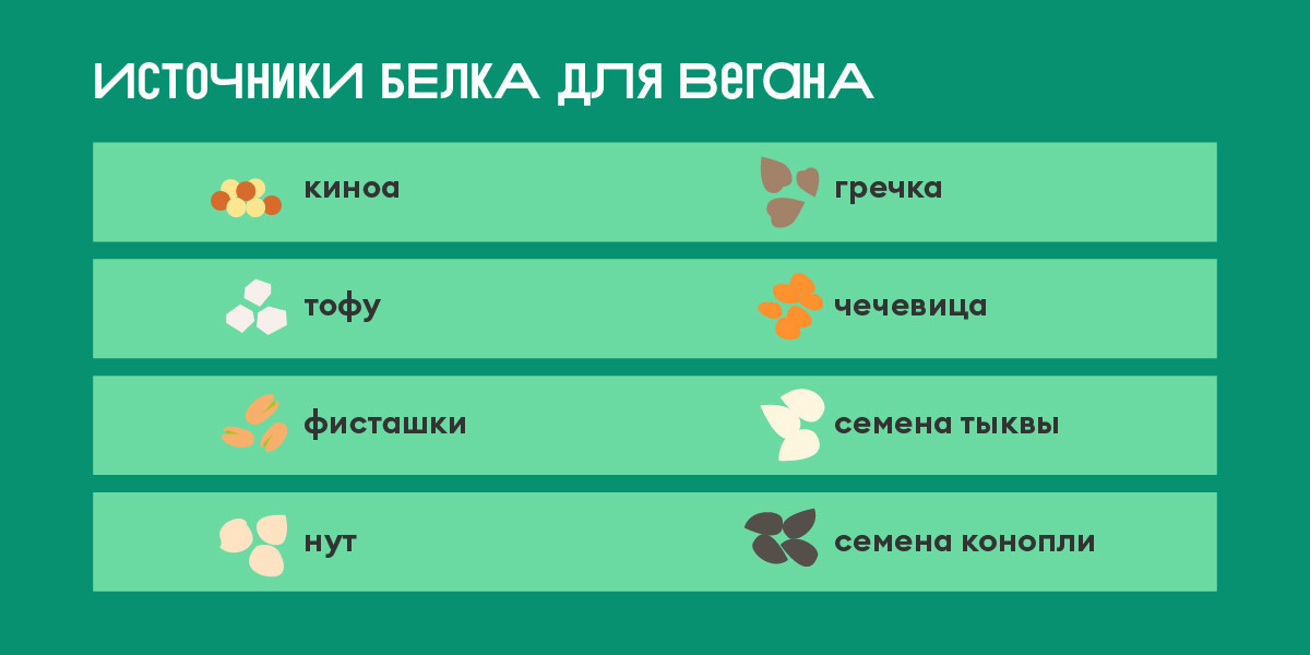 Растительные источники лизина: тофу, киноа, фисташки, чёрная фасоль, чечевица, тыква; метионина — подсолнечные семечки, нут, пекан, арахис, персики, авокадо, инжир и брокколи.