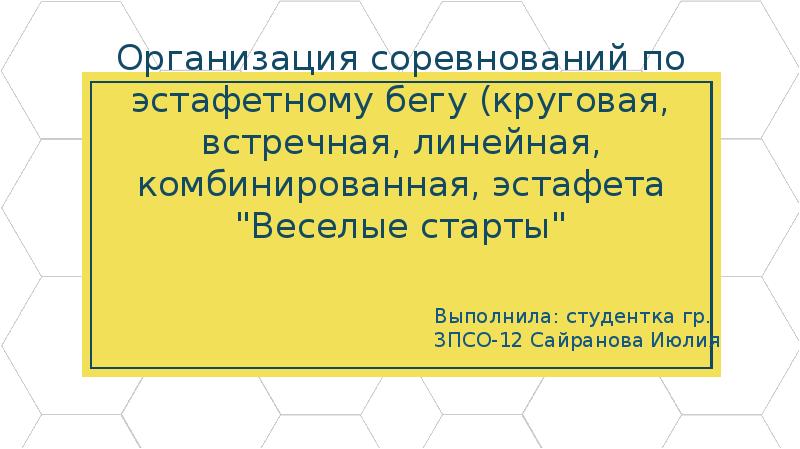 Организация соревнований по эстафетному бегу (круговая, встречная, линейная, комбинированная, эстафета "Веселые старты" Выполнила: студентка гр. 3ПСО-12 Сайранова Июлия
