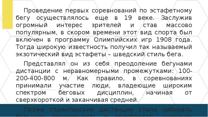 Проведение первых соревнований по эстафетному бегу осуществлялось еще в 19 веке. Заслужив огромный интерес зрителей и став массово популярным, в скором времени этот вид спорта был включен в программу Олимпийских игр 1908 года. Тогда широкую известность получил так называемый экзотический вид эстафеты – шведский стиль бега. Представлял он из себя преодоление бегунами дистанции с неравномерными промежутками: 100-200-400-800 м. Как правило, в соревнованиях принимали участие люди, владеющие широким спектром беговых дисциплин, начиная от сверхкороткой и заканчивая средней. Позже спринтерские дистанции стали набирать большую популярность и приобретать широкую симпатию у приезжих гостей.