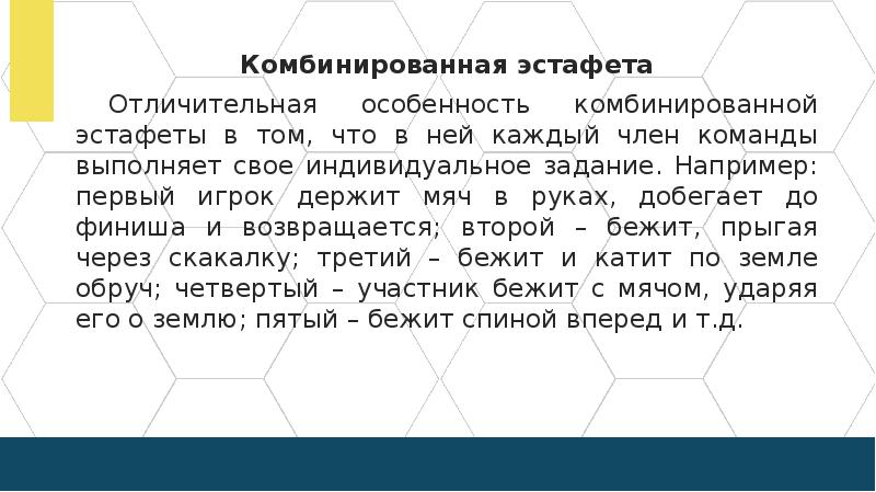 Комбинированная эстафета Комбинированная эстафета Отличительная особенность комбинированной эстафеты в том, что в ней каждый член команды выполняет свое индивидуальное задание. Например: первый игрок держит мяч в руках, добегает до финиша и возвращается; второй – бежит, прыгая через скакалку; третий – бежит и катит по земле обруч; четвертый – участник бежит с мячом, ударяя его о землю; пятый – бежит спиной вперед и т.д.