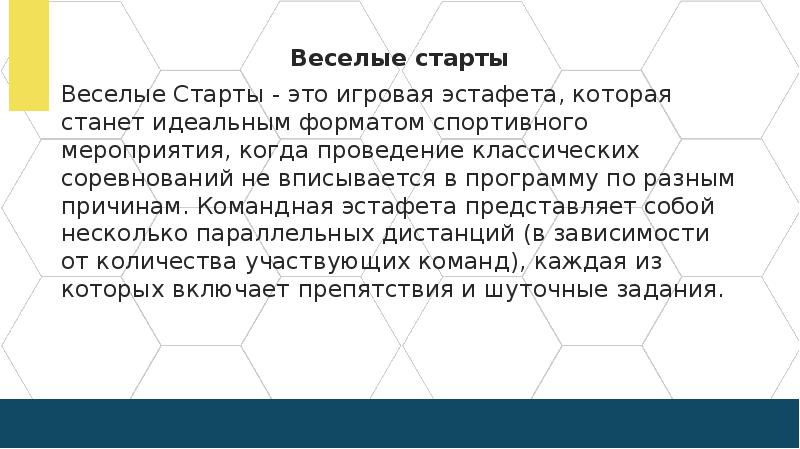 Веселые старты Веселые старты Веселые Старты — это игровая эстафета, которая станет идеальным форматом спортивного мероприятия, когда проведение классических соревнований не вписывается в программу по разным причинам. Командная эстафета представляет собой несколько параллельных дистанций (в зависимости от количества участвующих команд), каждая из которых включает препятствия и шуточные задания.
