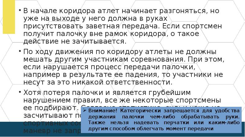 В начале коридора атлет начинает разгоняться, но уже на выходе у него должна в руках присутствовать заветная передача. Если спортсмен получит палочку вне рамок коридора, о такое действие не зачитывается. В начале коридора атлет начинает разгоняться, но уже на выходе у него должна в руках присутствовать заветная передача.