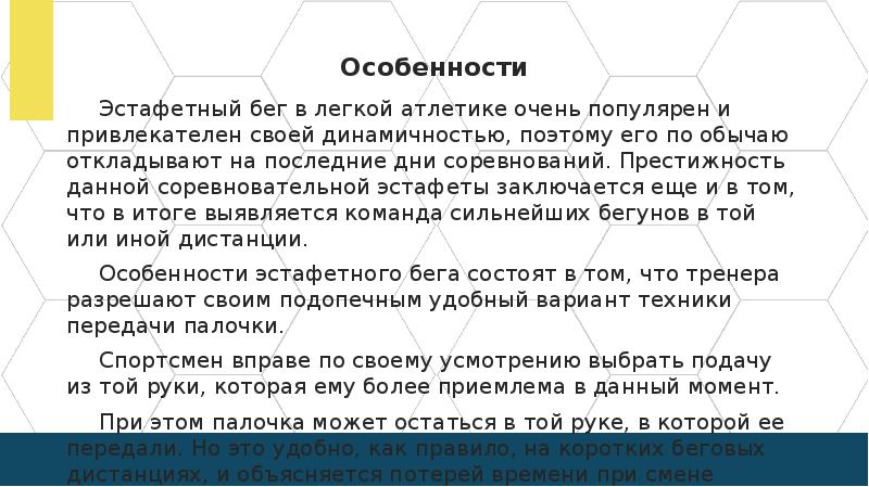 Особенности Особенности Эстафетный бег в легкой атлетике очень популярен и привлекателен своей динамичностью, поэтому его по обычаю откладывают на последние дни соревнований. Престижность данной соревновательной эстафеты заключается еще и в том, что в итоге выявляется команда сильнейших бегунов в той или иной дистанции.