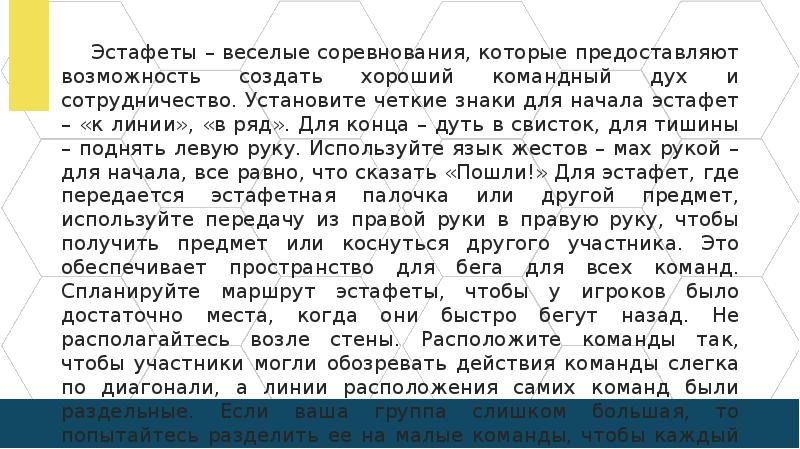 Эстафеты – веселые соревнования, которые предоставляют возможность создать хороший командный дух и сотрудничество. Установите четкие знаки для начала эстафет – «к линии», «в ряд». Для конца – дуть в свисток, для тишины – поднять левую руку.