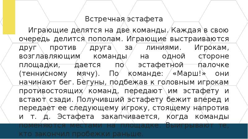 Бегуны, подбежав к головным игрокам противостоящих команд, передают им эстафету и встают сзади. Получивший эстафету бежит вперед и передает ее следующему игроку, стоящему напротив и т. д. Эстафета закапчивается, когда команды поменяются местами на площадке. Выигрывают те, кто закончил пробежки раньше.