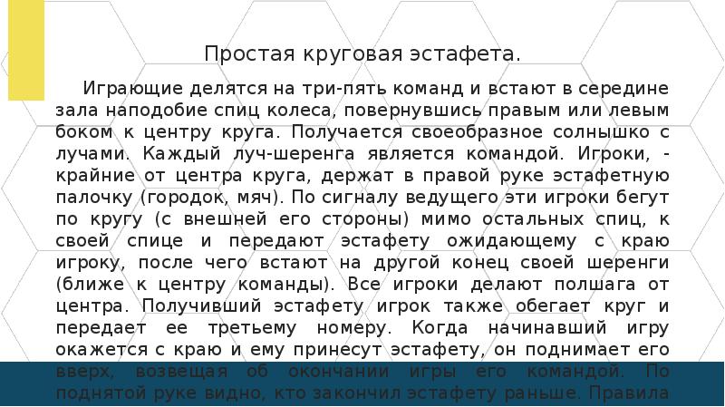 Простая круговая эстафета. Простая круговая эстафета. Играющие делятся на три-пять команд и встают в середине зала наподобие спиц колеса, повернувшись правым или левым боком к центру круга. Получается своеобразное солнышко с лучами. Каждый луч-шеренга является командой.