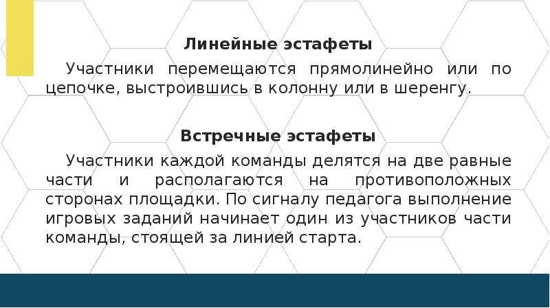 Линейные эстафеты Линейные эстафеты Участники перемещаются прямолинейно или по цепочке, выстроившись в колонну или в шеренгу. Встречные эстафеты Участники каждой команды делятся на две равные части и располагаются на противоположных сторонах площадки. По сигналу педагога выполнение игровых заданий начинает один из участников части команды, стоящей за линией старта.
