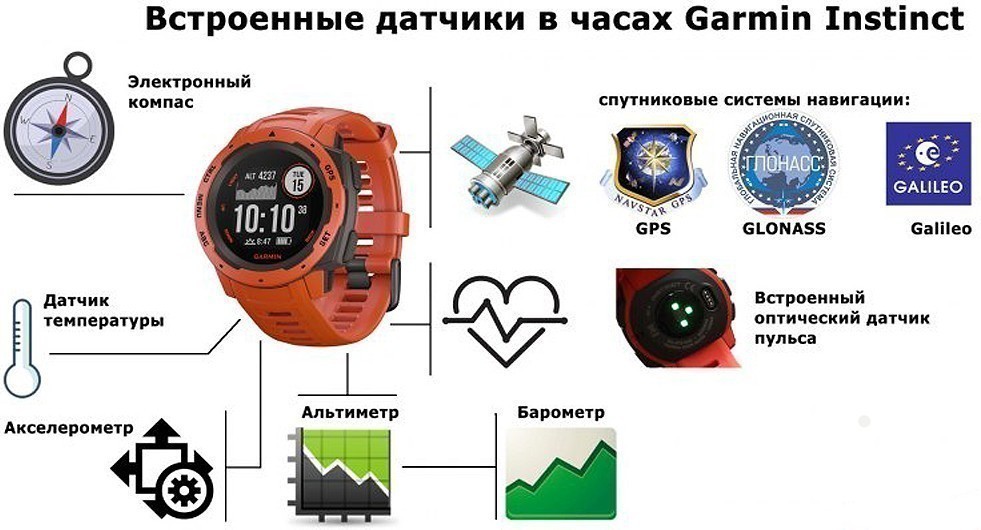 В часы серии «Инстинкт», кроме датчика пульса и акселерометра, встроены: