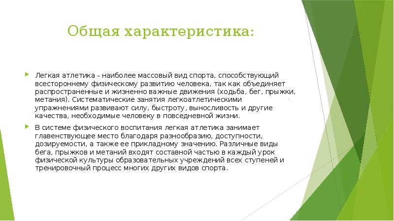 Общая характеристика: Легкая атлетика — наиболее массовый вид спорта, способствующий всестороннему физическому развитию человека, так как объединяет распространенные и жизненно важные движения (ходьба, бег, прыжки, метания). Систематические занятия легкоатлетическими упражнениями развивают силу, быстроту, выносливость и другие качества, необходимые человеку в повседневной жизни. В системе физического воспитания легкая атлетика занимает главенствующее место благодаря разнообразию, доступности, дозируемости, а также ее прикладному значению. Различные виды бега, прыжков и метаний входят составной частью в каждый урок физической культуры образовательных учреждений всех ступеней и тренировочный процесс многих других видов спорта.