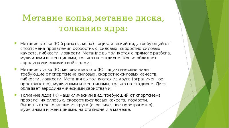 Метание копья,метание диска, толкание ядра: Метание копья (К) (гранаты, мяча) — ациклический вид, требующий от спортсмена проявления скоростных, силовых, скоростно-силовых качеств, гибкости, ловкости. Метание выполняется с прямого разбега, мужчинами и женщинами, только на стадионе. Копье обладает аэродинамическими свойствами.