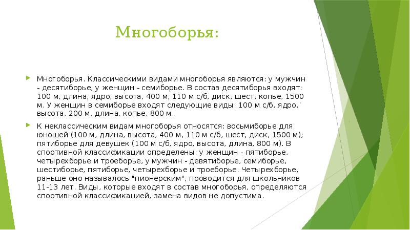 Многоборья: Многоборья. Классическими видами многоборья являются: у мужчин — десятиборье, у женщин — семиборье.