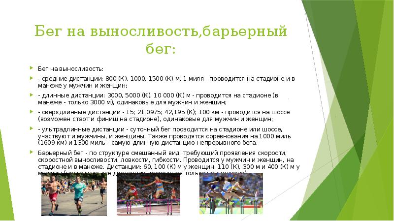 Бег на выносливость,барьерный бег: Бег на выносливость: — средние дистанции: 800 (К), 1000, 1500 (К) м, 1 миля — проводится на стадионе и в манеже у мужчин и женщин; — длинные дистанции: 3000, 5000 (К), 10 000 (К) м — проводится на стадионе (в манеже — только 3000 м), одинаковые для мужчин и женщин; — сверхдлинные дистанции — 15; 21,0975; 42,195 (К); 100 км — проводится на шоссе (возможен старт и финиш на стадионе), одинаковые для мужчин и женщин; — ультрадлинные дистанции — суточный бег проводится на стадионе или шоссе, участвуют и мужчины, и женщины. Также проводятся соревнования на 1000 миль (1609 км) и 1300 миль — самую длинную дистанцию непрерывного бега. Барьерный бег — по структуре смешанный вид, требующий проявления скорости, скоростной выносливости, ловкости, гибкости. Проводится у мужчин и женщин, на стадионе и в манеже. Дистанции: 60, 100 (К) м у женщин; 110 (К), 300 м и 400 (К) м у мужчин (последние две дистанции проводятся только на стадионе).