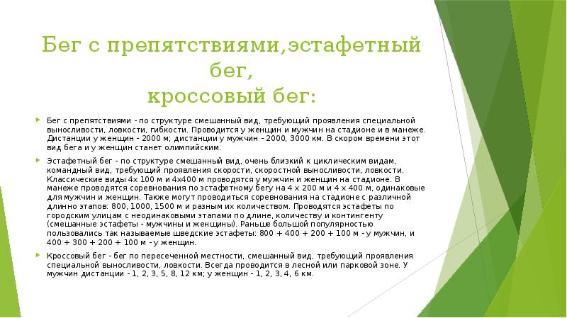 Бег с препятствиями,эстафетный бег, кроссовый бег: Бег с препятствиями — по структуре смешанный вид, требующий проявления специальной выносливости, ловкости, гибкости. Проводится у женщин и мужчин на стадионе и в манеже. Дистанции у женщин — 2000 м; дистанции у мужчин — 2000, 3000 км. В скором времени этот вид бега и у женщин станет олимпийским.