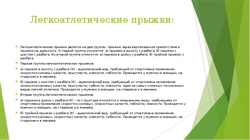 Первая группа легкоатлетических прыжков: а) прыжок в высоту с разбега (К) — ациклический вид, требующий от спортсмена проявления скоростно-силовых качеств, прыгучести, ловкости, гибкости. Проводится у мужчин и женщин, на стадионе и в манеже; б) прыжок с шестом с разбега (К) — ациклический вид, требующий от спортсмена проявления скоростно-силовых качеств, прыгучести, гибкости, ловкости, один из самых сложных технических видов легкой атлетики.